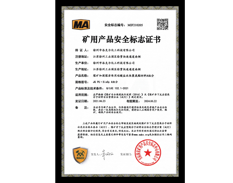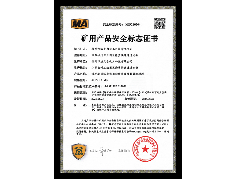 煤矿加固煤岩体用聚氨酯材料安标证书